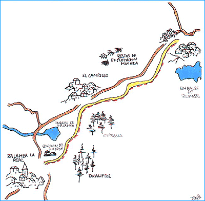 Nuestro camino discurre entre el embalse de Zalamea a nuestra izquierda y las repoblaciones forestales de eucaliptos a nuestra derecha. Así llegamos hasta el pueblo de El Campillo, donde tras unas casas nuestra vía continúa cercana a la carretera hacia Riotinto. A nuestra izquierda, a lo lejos, se pueden observar los restos de explotaciones mineras. Antes de entrar en el pueblo, a nuestra derecha, nos queda a un kilómetro de distancia el embalse del Zumajo. |