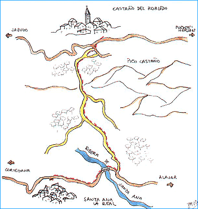 Entorno : Sierra de Aracena. Santa Ana-Castaño del Robledo. Lugar de referencia : Santa Ana la Real. (Ver itinerario anterior). Acceso : Mediante vehículo propio. Ver itinerario anterior sobre Santa Ana. Dificultad : Fácil inicialmente, la orientación es fácil de perder en su segundo tramo; el perfil es ascendente. Duración : Tres horas. |