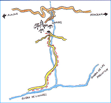 Entorno : Linares-Ribera de Linares. Lugar de referencia :Linares de la Sierra, a 6 km. de Aracena y a 7 de Alájar. (Ver itinerario 1). Acceso : mediante vehículo propio. En autobús, de igual modo que hasta Alájar. Ver itinerario 1. Dificultad : Fácil. Duración : Una hora. De la parte baja y más al sur del pueblo, junto al lavadero público de ropa, parte empedrado el camino de la ribera. En sus comienzos podremos ver paralelas a la ribera innumerables huertas y pocilgas de cría de cerdo ibérico y metros de muro de piedra de media altura cubiertos de durillo y hiedra, muestra de la mejor arquitectura serrana y rural. |