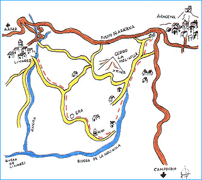 Entorno : Sierra de Aracena. Linares-Aracena por La Molinilla. Lugar de referencia :Linares de la Sierra, a 6 km. de Aracena y a 7 de Alájar. (Ver itinerario 1). Acceso : mediante vehículo propio. En autobús, de igual modo que hasta Alájar. Ver itinerario 1. Dificultad : Media. Duración : Cuatro horas.